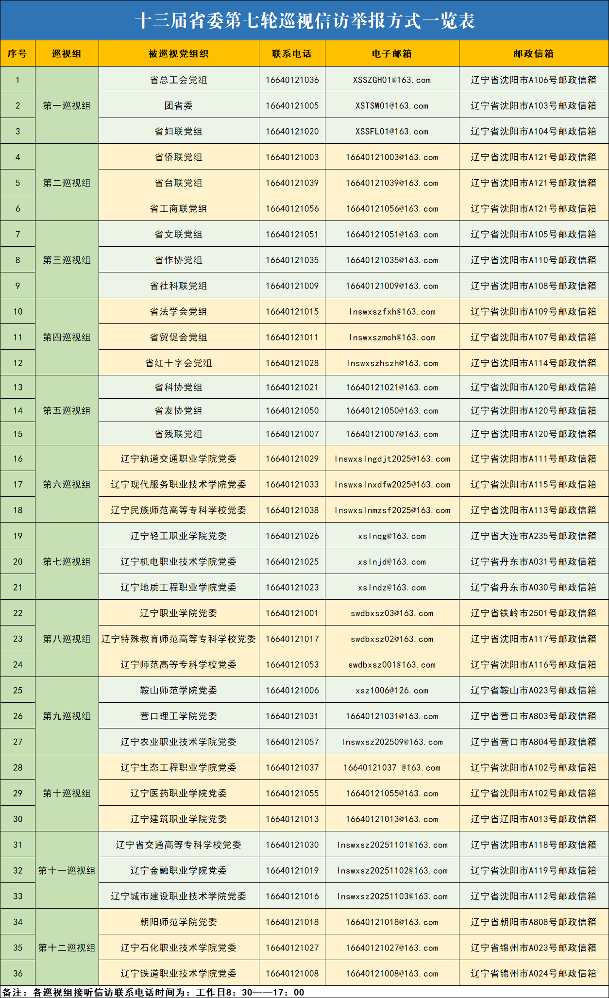 按照有关要求,12个省委巡视组将在被巡视单位工作2个半月左右,期间设置巡视意见箱,开通信访举报联系电话、电子邮箱及“二维码”,主要受理反映被巡视党组织领导班子及其成员,下一级党组织主要负责人和重点岗位人员问题的来信来电来访,重点是关于违反政治纪律、组织纪律、廉洁纪律、群众纪律、工作纪律和生活纪律以及巡视、审计整改等方面问题反映。