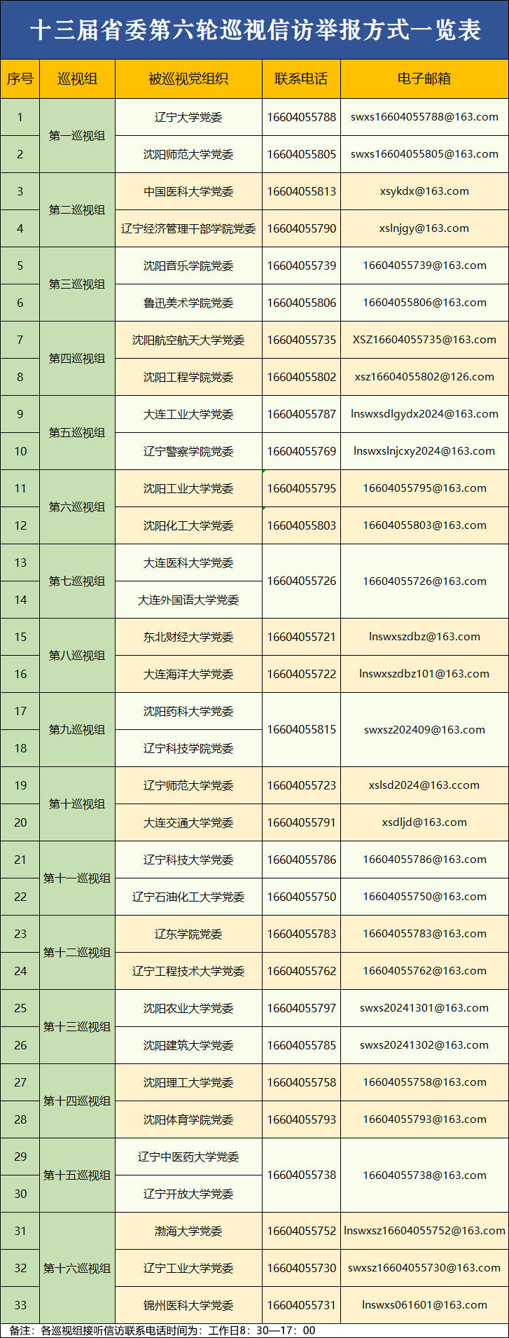 按照有关要求,16个省委巡视组将在被巡视单位工作两个半月,其间设置巡视意见箱,开通信访举报联系电话、电子邮箱及“二维码”,主要受理反映被巡视党组织领导班子及其成员,下一级党组织主要负责人和重点岗位人员问题的来信来电来访,重点是关于违反政治纪律、组织纪律、廉洁纪律、群众纪律、工作纪律和生活纪律以及巡视整改等方面问题反映。