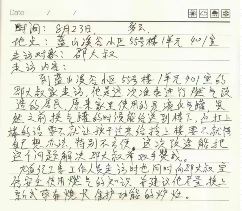 “家里使用的是液化气罐,每次换罐只给送到楼下,赶上子女不在家,怎么扛上楼都要犯上好一阵愁”。在蓝山溪谷小区55#楼邵大爷家中,元宝区九道街道纪工委书记郝赋川一边耐心听着邵大爷的反映,一边将详细情况记录在他的《走访日记》中。